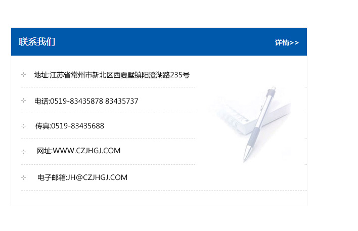 地址:常州市新北區友邦商務大廈1幢16、17層  電話:0519-85101652  傳真:0519-85112595  郵編:213022  網址:www_cz-jiayue_cn.chinadieya.com  郵箱:xiajifengaa@163.com